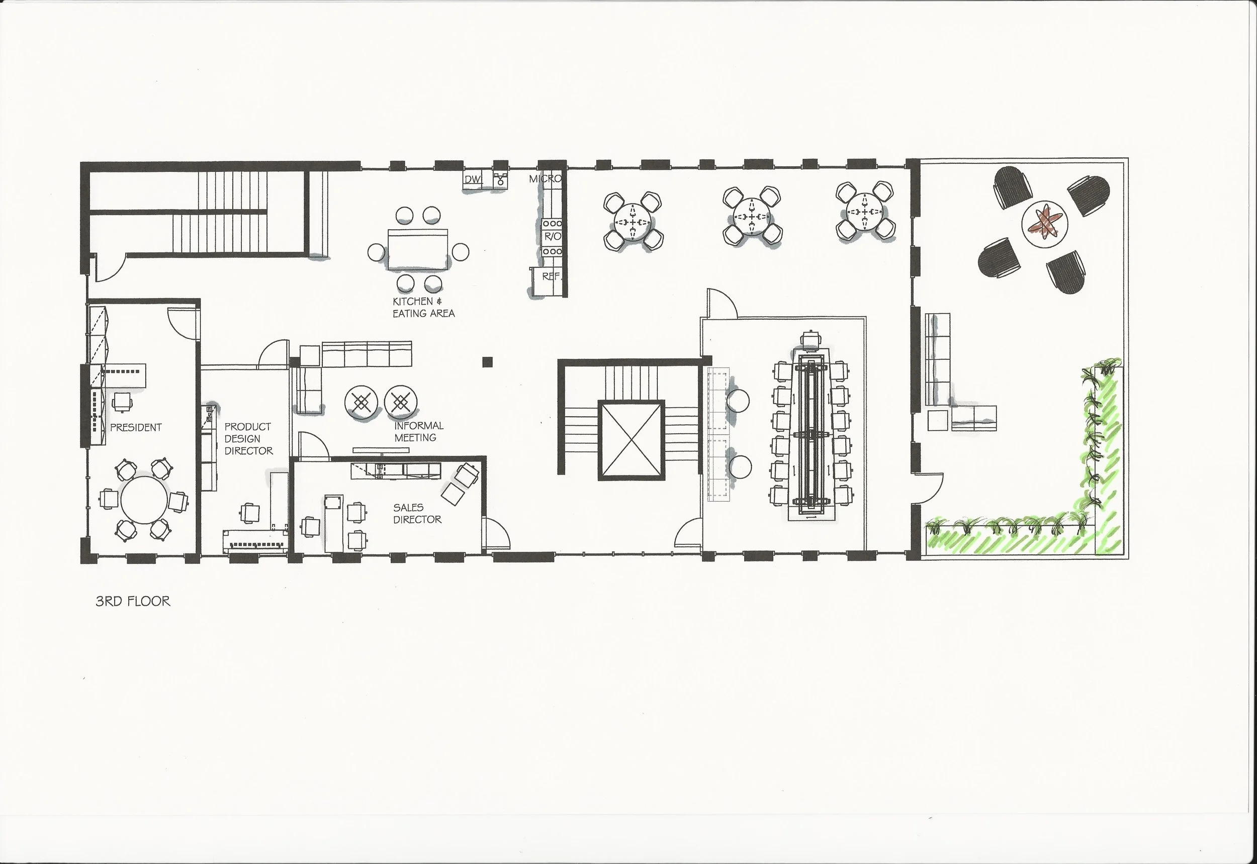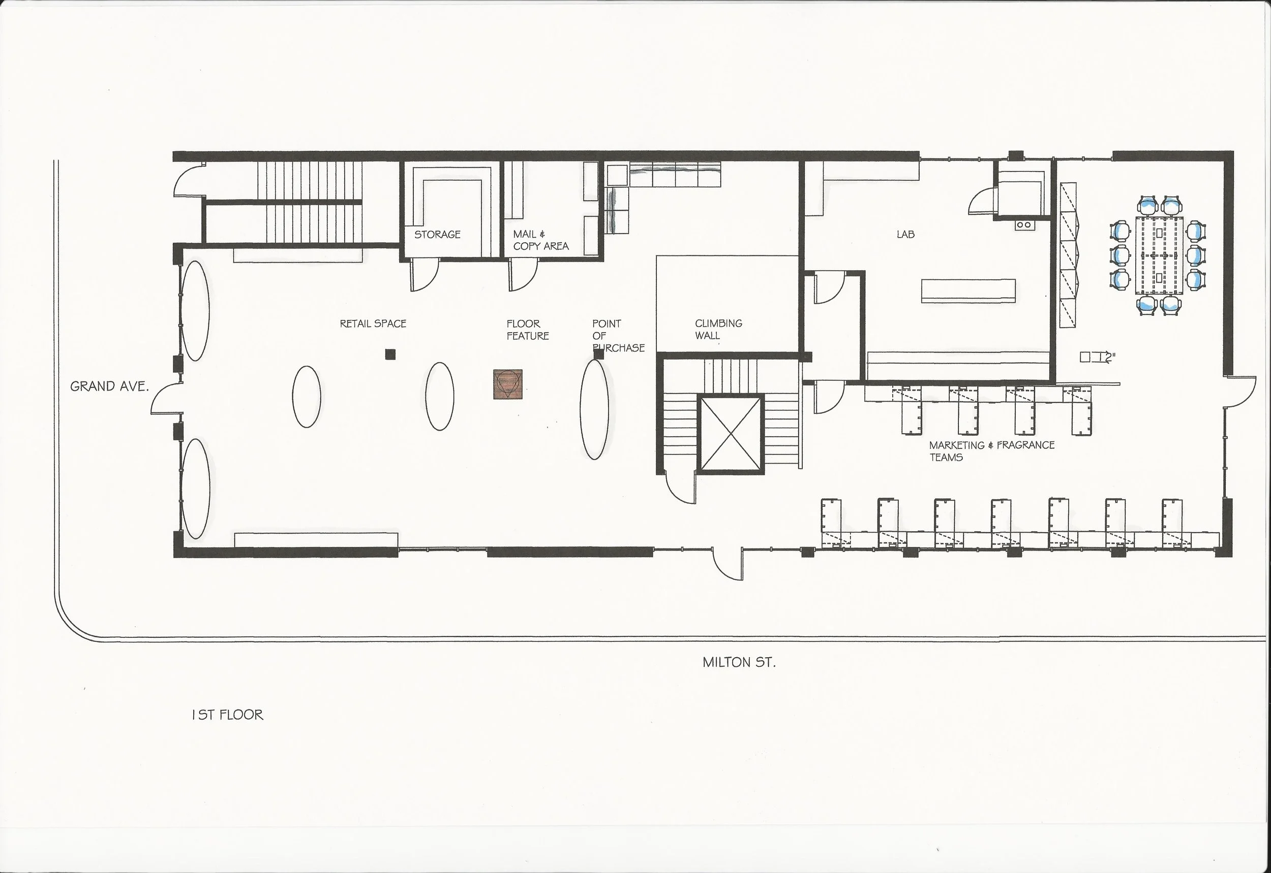 Flagship retail and corporate headquarters designed for Tonique, a fictional boutique men’s fragrance and skincare brand. Each floor features flexible work space and small group meeting areas . The first floor offers a climbing wall. The second floor offers a quiet room and the third floor offers a patio with a live wall and campfire.